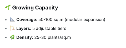 "As pioneers in Asian urban agriculture, we selected the Voyager Package for a pilot expansion. The system integrated seamlessly with our existing infrastructure, providing valuable data for future large-scale deployment." Key Results: Yield Increase: 85% higher than traditional rack systems Energy Optimization: 42% energy saving with LED system Space Efficiency: 2.3x higher output per square meter Decision Support: Data-driven cultivation planning optimization Special Adaptations: Tropical climate adaptation, High humidity environment optimization, Limited space maximization