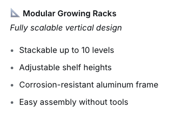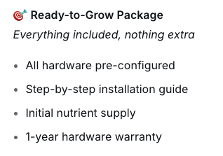 The Voyager Package transforms first-time growers into successful vertical farmers. Designed for simplicity and rapid deployment, our plug-and-play system eliminates technical barriers and gets you growing in weeks—not months.